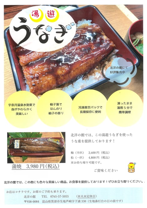 北洋の館で湯遊うなぎを冷凍真空パックにて販売しております。