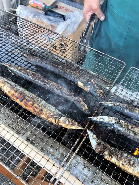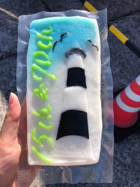 北洋の館でも何か記念に振舞わねばねということで、「焼きサンマ」!そして「特注!生地鼻灯台カマボコ」!!を配りました。北洋の館にしては頑張った。