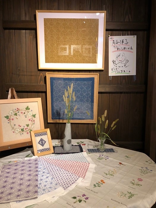 刺し子の見事なこと・・・幾何学的な連続柄がビシッと整然と。和柄には縁起を担いだものが多いそうで、麻の葉や籠目の文様は魔除け、菱文様は無病息災など。素敵です。